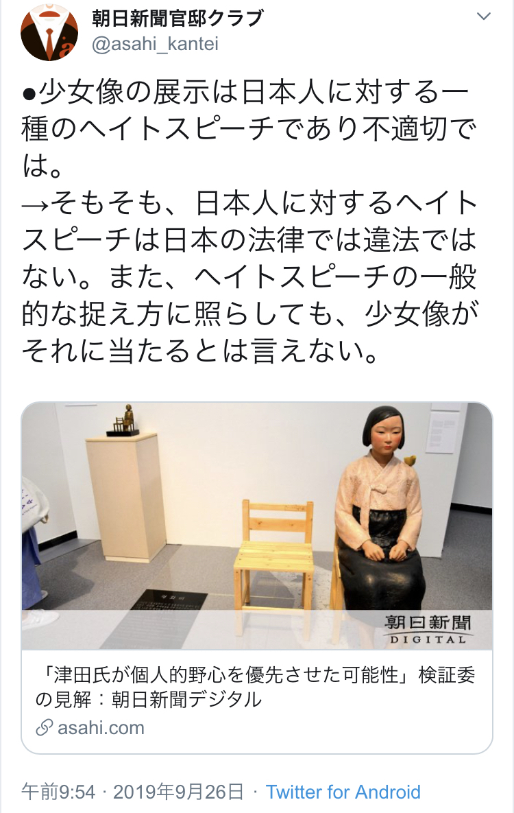 →そもそも、日本人に対するヘイトスピーチは日本の法律では違法ではない。また、ヘイトスピーチの一般的な捉え方に照らしても、少女像がそれに当たるとは言えない。https://t.co/2yMsY4gt1u