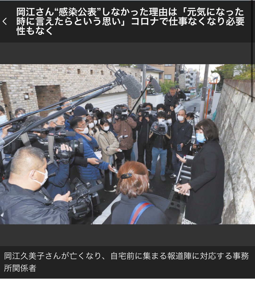 世田谷区にある岡江さんの自宅前には前日から多数の報道陣が殺到していたが、東京中日スポーツが所属事務所の関係者が取材に応じた様子を伝えた際に、「自宅前に集まる報道陣に対応する事務所関係者」とキャプションをつけた記事がネットに配信すると、たちまちネット民が反応。