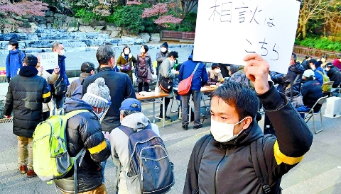 寒空の下、食料配布が始まる前から、多くの人たちの順番を待つ姿が。