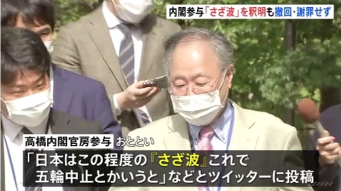 経済・財政政策を担当する参与として、菅義偉首相に助言を行っている高橋氏は9日、ツイッターで各国の新規感染者数のグラフを引用し「日本はこの程度の『さざ波』。これで五輪中止とかいうと笑笑」と投稿し、SNS上などから「不謹慎」「人命軽視」などと批判の声が上がっている。