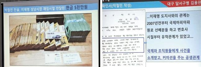 金議員によると、パク氏は「5万ウォン札と1万ウォン札の札束5000万ウォンを李知事と(国際マフィア派出身の実業家)イ・ジュンソク代表が喫茶店で話している間に李知事の車に積み込んだ」と証言したという。金議員は「パク氏の友人というJ氏も5万ウォン札と1万ウォン札で現金約1億ウォンを李知事に渡したという」と発言した。