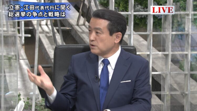 江田氏はこの日、BSフジの「プライムニュース」に出演。同党の政権公約で「1億総中流社会」を掲げたことに絡み、「今まで野党はばらまきだ、財源を示さない、と散々言われてきた。法人税と所得税の優遇税制は直す」と財源確保に向けた増税が必要だと主張。
