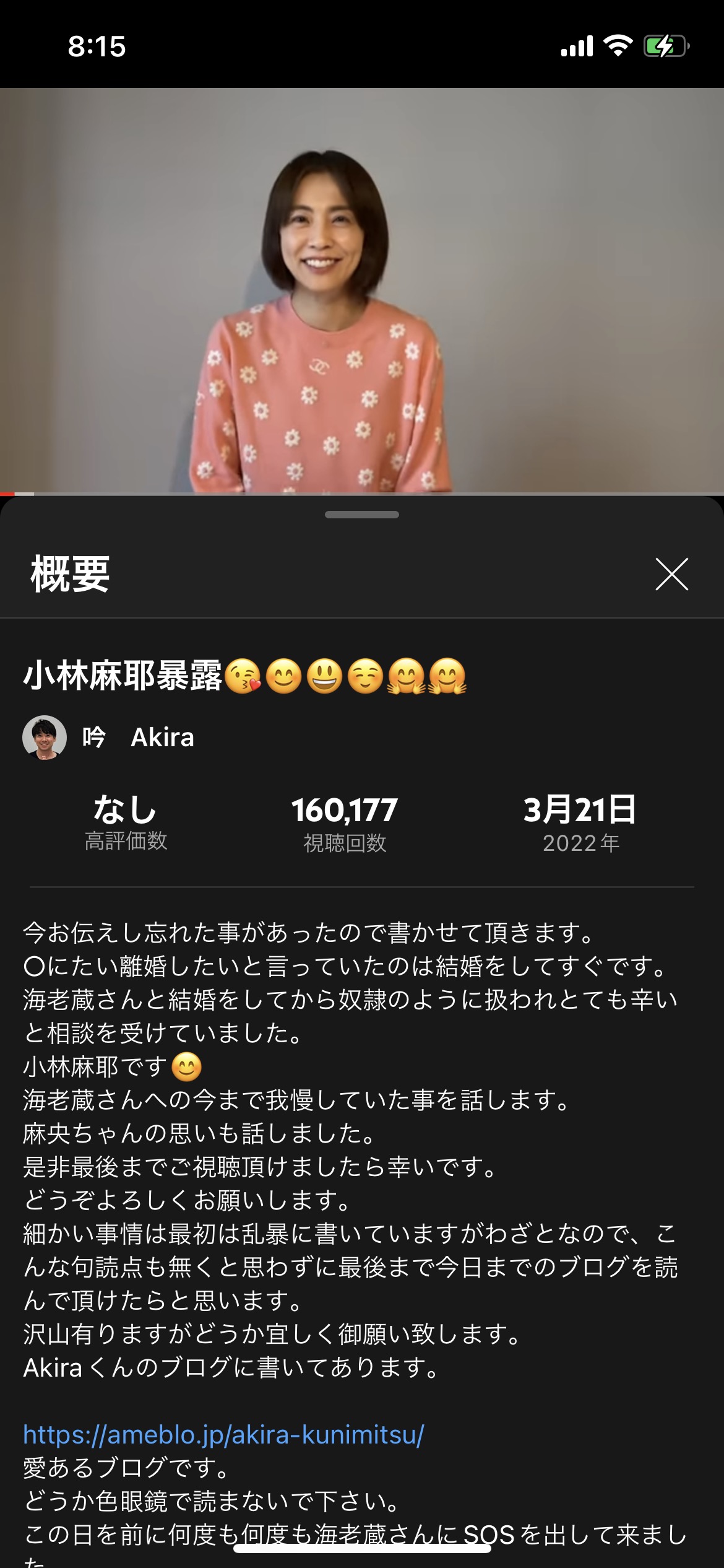 『小林麻耶オフィシャルブログ「Life is Beautiful」』によると、元夫のYouTubeチャンネル『吟Akira』の2本の動画に出演した小林麻耶は「海老蔵さんへの今まで我慢していたこと」「麻央ちゃんの思い」について語っているという。今日のこの日まで何度も市川海老蔵にSOSを出してきたが“知らんぷり”で、22日で9歳になる甥の誕生会にも呼ばれていないと悲しんでいる。