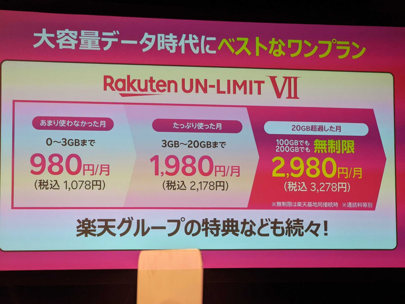 楽天モバイルは、従来の料金プランを改定した新バージョン「Rakuten UN-LIMIT VII」を発表した。月額980円~月額2980円の変動制となる。一方で、これまでのプランと比べ0円で利用できる幅がなくなる。7月1日に改定される。