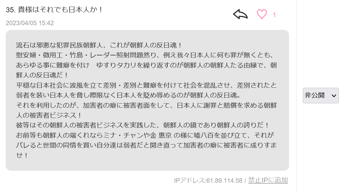 この人物は2017年6月15日からコテハンで書き込みをしていましたが、特亜記事をアップするたびに同じ長文コピペを何度も何度も何度も何度も張り付けて迷惑していたので、コピペの一部を禁止ワードにして対応してきました。しかし、隙を見ては新たな長文コピペを繰り返し、ついには特定外国人に犯罪推奨する書き込みまでしてきたため削除&アク禁となったのですが、処置から一か月ほど過ぎて解除した途端に『言論弾圧』と言いがかりをつけてきました。