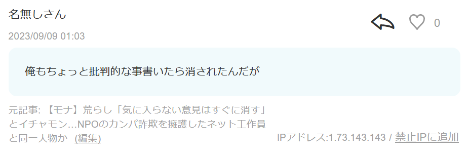 >昨日、小杉沙織氏のカンパ詐欺事件についてまとめたところ、謎の人物が合計15回も擁護の書き込みをしてきました。