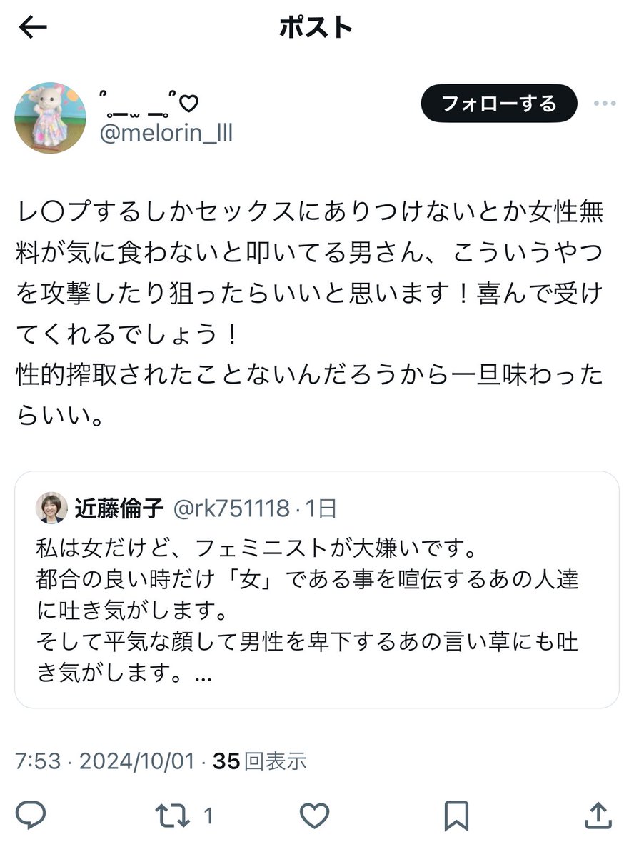 みちゃん、と名乗る方は該当投稿を削除されましたが、これはどう読んでも私に対する性加害を扇動する内容です。 pic.twitter.com/OLNRlThhQs