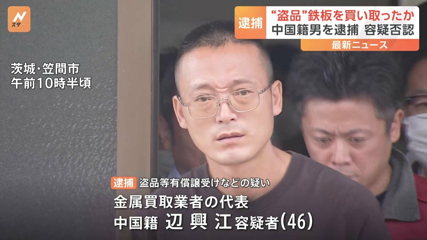 茨城県笠間市小原の金属買取業者「東勝産業合同会社」は5月、茨城県牛久市内の道路舗装の工事現場から市毛勝司容疑者ら男4人によって盗まれた重さ1.6トンほどの鉄板6枚を盗まれたものと知りながら、合計54万円で買い取って収益を得た疑いが持たれています。