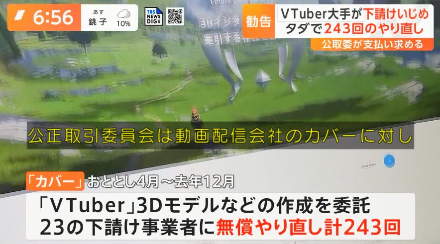 バーチャルユーチューバー(Vチューバー)の動画制作を巡り、下請け業者に無償でやり直させていたとして、公正取引委員会は25日、下請法違反で、東証グロース上場の「カバー」(東京)に再発防止を勧告した。