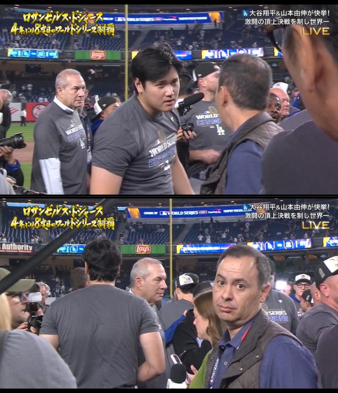 お祝いムードによって大谷の態度も和らいだのだろう。そんな中、彼の“菩薩”の顔を再び“般若”に変えたメディアがあった。優勝の瞬間、マウンド付近に集まりチームメートやコーチらと優勝の喜びを分かち合っていた大谷は、球団関係者らしき男性から声をかけられ、一度は促された方向へと歩き出した。