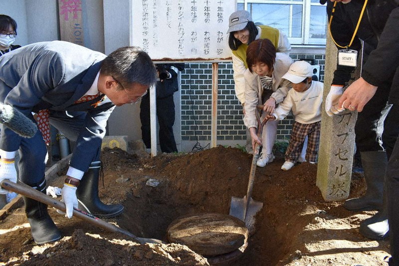 目印として建てた石碑の近くを卒業生らが順番にスコップで約10分、土を掘り進めると、直径45センチほどの蓋(ふた)が見えた。陶器の丸い釜のタイムカプセルを開けると、当時の在校生約560人の作文や絵画が出てきた。