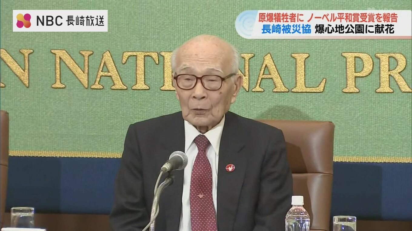 爆心地公園を訪れたのは長崎被災協の田中重光会長らで、原爆落下中心地碑に花を手向け、日本被団協のノーベル平和賞受賞を報告しました。