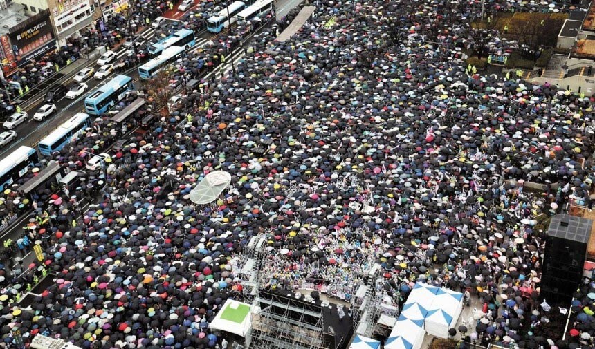 釜山気象庁によると、釜山には同日、20.6ミリメートルの雨が降ったという。しかし、デモ参加者たちは釜山駅広場だけでなく、地下鉄駅の中や路地、ビルの屋上まで埋め尽くした。人々は広場前の中央大路にまであふれ、警察官約320人が車道を2車線規制した。