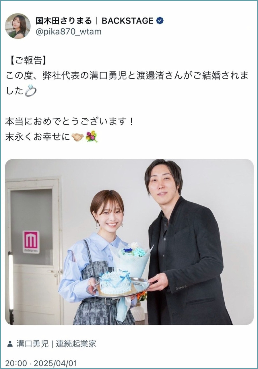 その写真を使用し、国木田氏は2人が結婚したなどとエイプリルフールに投稿。大きな話題を集めていたが、溝口氏は「さすがにこれはやりすぎ。消して」と指摘していた。