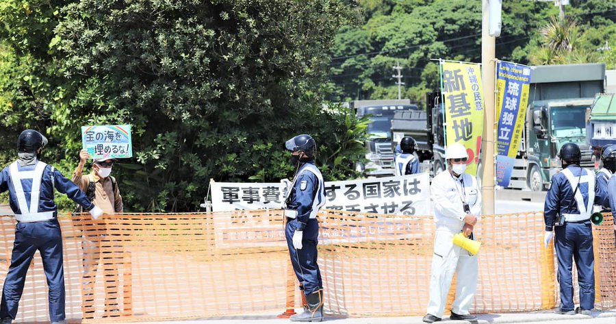 関係者によると、3月17日午前11時35分ごろ、辺野古移設工事に使う土砂を搬出する名護市安和の桟橋入り口で、抗議者の男性が安全ネットをまたいで乗り越えようとした際、足に絡まり、ネットを持っていた警備員が地面に転倒したという。