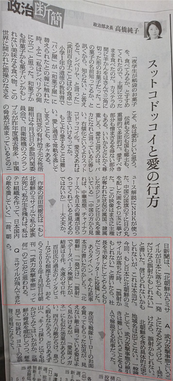 朝日新聞・高橋純子「一発だけなら誤射なんて書いたかしら? ああ、あの記事は一般論として書いたからセーフ」