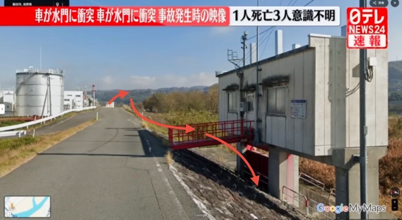 飯田市松尾清水の天竜川沿いの堤防道路で、24日午後0時半ころ、男性4人が乗った乗用車が転落し、水門に衝突しました。