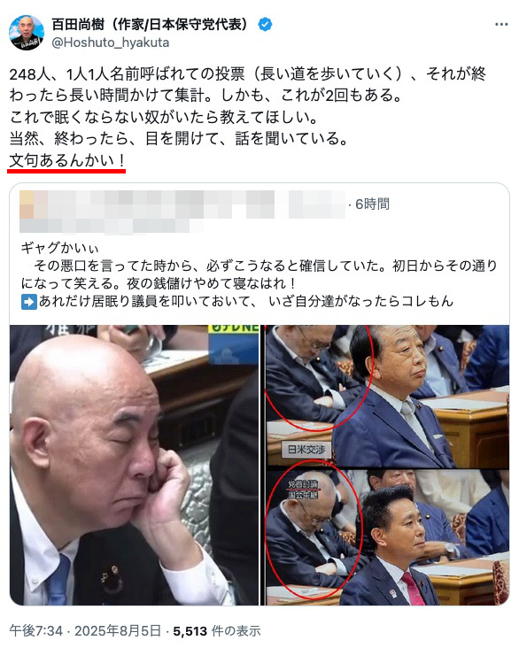 — 百田尚樹(作家/日本保守党代表) (@Hoshuto_hyakuta) August 5, 2025