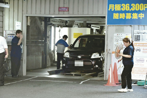 駐車場は、車両を台座に載せ、エレベーターのように垂直方向に移動させてビル内に保管するタイプ。曽根崎署は誤作動の可能性も含めて、シャッターの開閉操作の状況などを調べている。