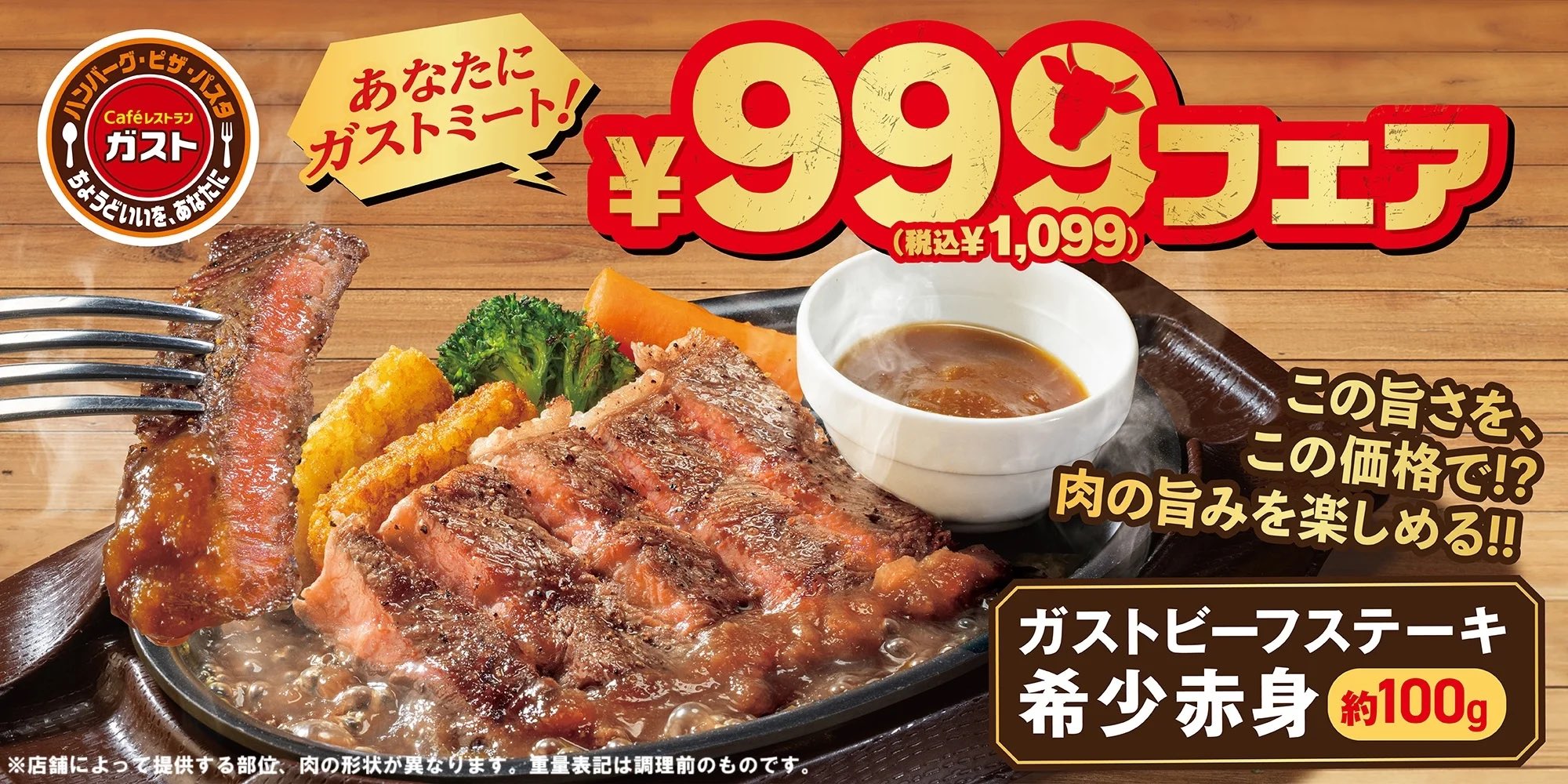 希少部位の赤身をステーキに使っているとうたい、数量限定だとして、100グラムを税別999円と、1000円を切る価格で提供している。広告では、「写真はイメージです。店舗によって提供する部位、肉の形状が異なります」「重量表示は調理前のものです」との注意書きも付けられた。