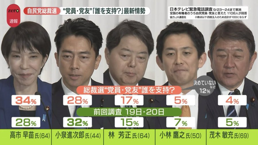 また、調査では、過去6年間に自民に投票し、この参院選で国民.参政.保守のいずれかの政党に投票した518人に、次回の国政選挙で、現在行われている自民総裁選の5人の各候補のうち、だれが総裁なら自民に投票するかを質問した。