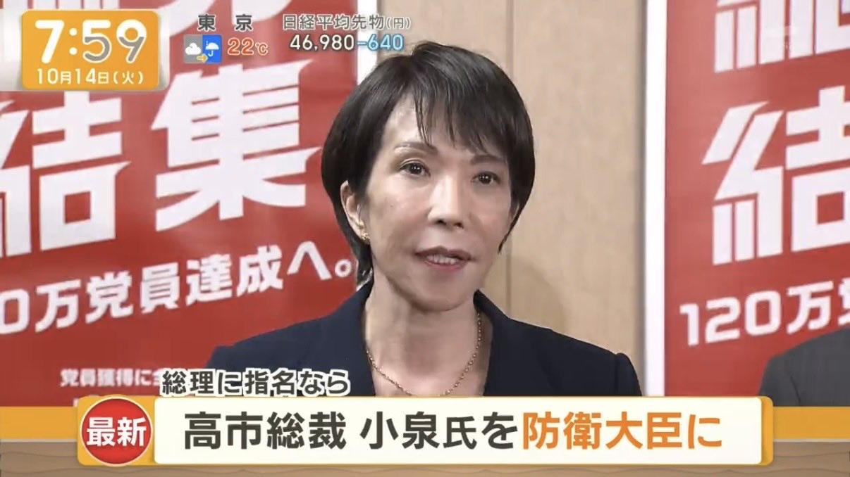 【高市早苗内閣人事】自民党・高市早苗総裁が総理大臣に指名なら、小泉進次郎が防衛大臣、林芳正が総務大臣 pic.twitter.com/pEoJyeuOyt