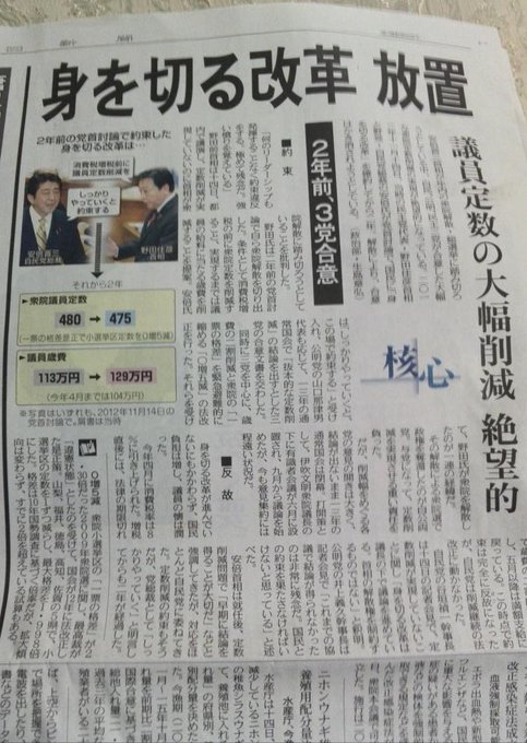 安倍党首と野田首相は2年前の党首討論で約束した。①消費増税分は社会保障の充実に②衆議院定数削減を行う。当然、与党になった党が実現するはずの約束。でも自民はどちらも守っていない。これを許してはいけない。 http://t.co/B0d1dA5ZWz