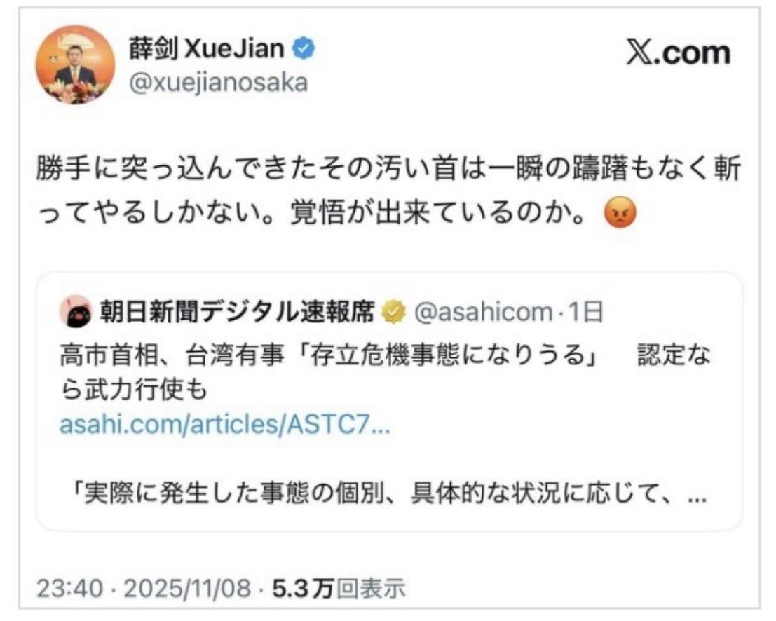 The mask slips — again. Just a few months ago, @xuejianosaka compared Israel with Nazi Germany. Now, he threatens Prime Minister @takaichi_sanae and the Japanese people. Time for Beijing to behave like the “good neighbor” it talks repeatedly about — but fails repeatedly to… pic.twitter.com/QslQqirtPO