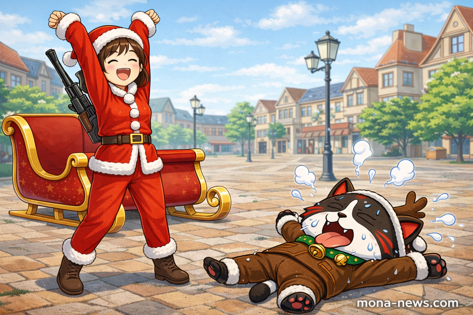 モナニャンと一緒にいるサンタクロースの姿をした女性の名前は「猪鹿猟子(いのしかりょうこ)」で、モナニュースYouTubeチャンネルで配信中の動画「教えてモナニャン」の司会進行を務めています。モナニャンだけだと生成AIで使うキャラが足りなかったので、猪鹿さんもサムネイル画像に出演させているのですが、ChatGPTの学習が進んだことで萌えキャラ化してきて、こんなかわいらしいサンタ画像を作れるまでに成長しました。