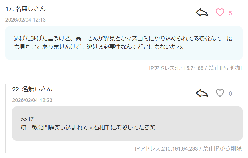 逃げた逃げた言うけど、高市さんが野党とかマスコミにやり込められてる姿なんて一度も見たことありませんけど。逃げる必要性なんてどこにもないだろ。