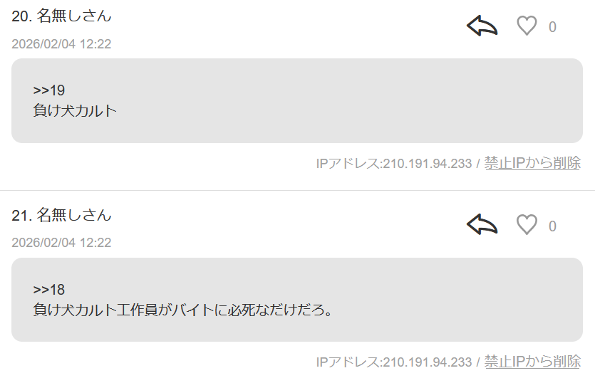 ※「負け犬カルト」連呼してたので創価アンチかと思ったら、まさかのれいわ信者でした。もし>>24の段階で即座にアク禁していなかったら全コメントに「負け犬カルト」をつけていたと思われます。